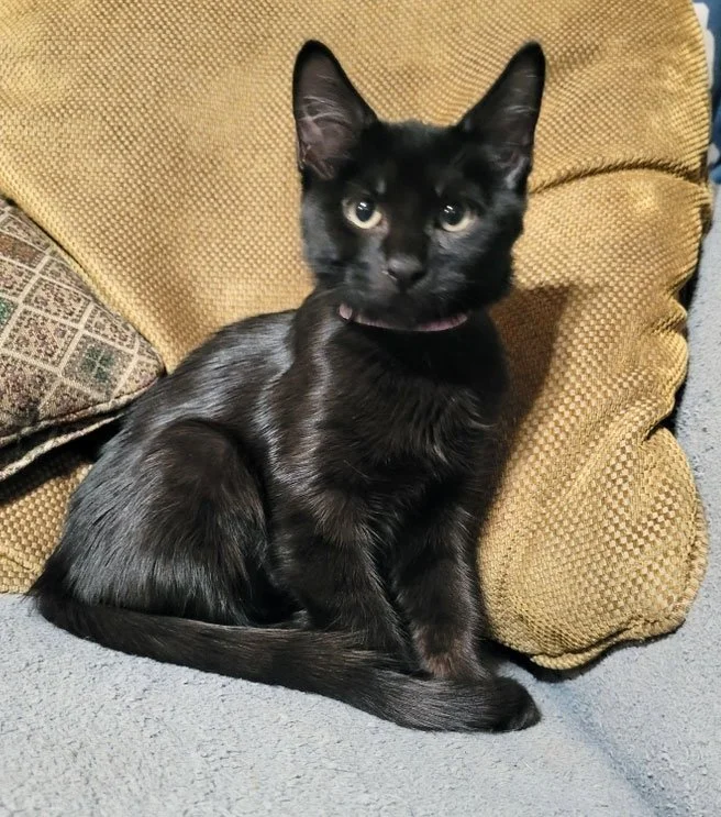 “I found Feng Min, then called Penelope, on Pet Finder and finally met her at a Furry Friends adoption event at PetSmart. I chose her because, ever since I was young, I had wanted a black kitty and because I loved her orange eyes as well.