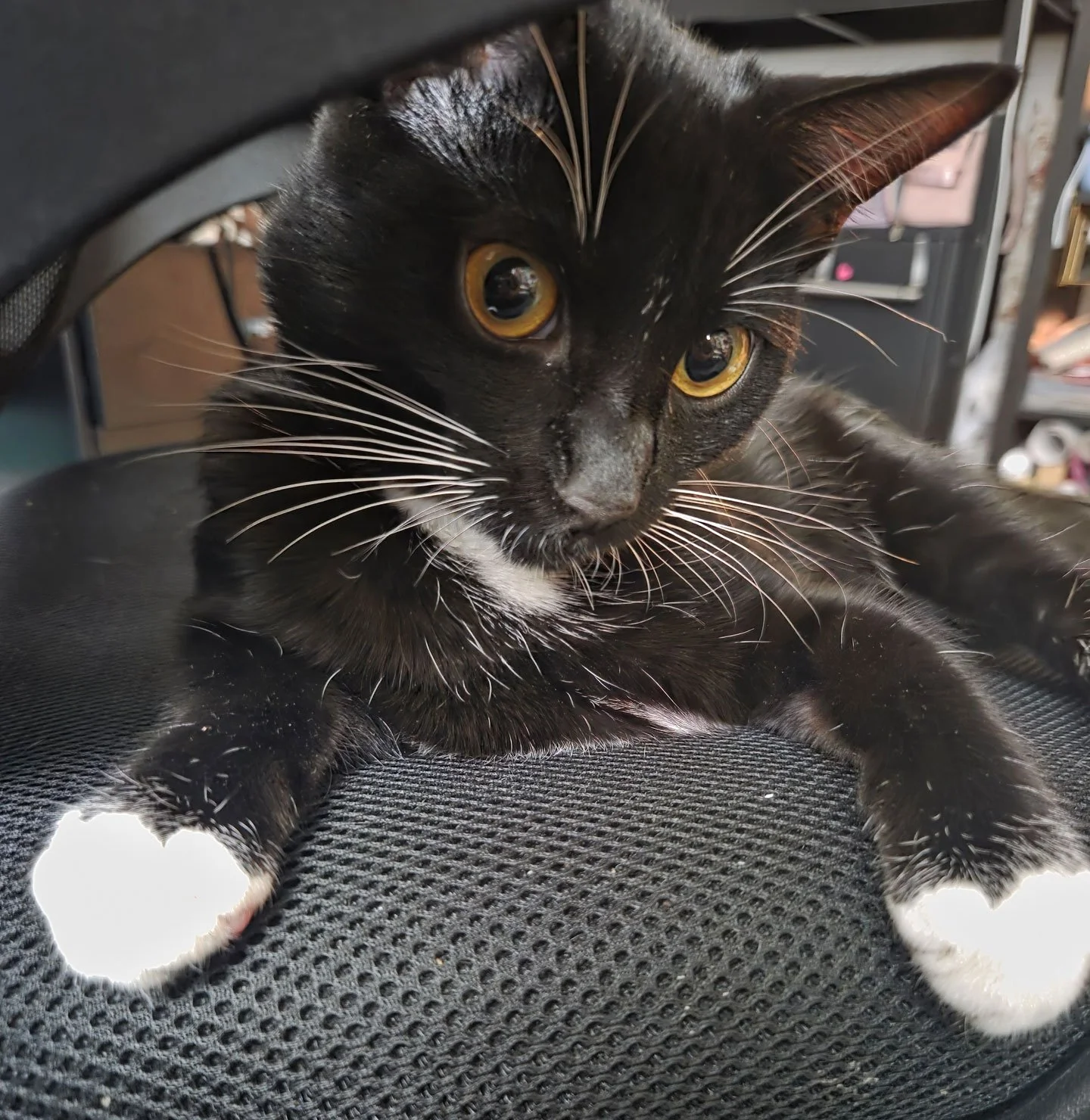 Emodini, our 14-year-old sphynx who’s somewhat grumpy tolerates Mocha, while Mira, our 3-year-old tuxedo/locket female Mira is very intrigued by her. Although Mocha can be a little rough, she gets along well with Mira, even pushing her to try new things and showing her that they’re fun, not scary!