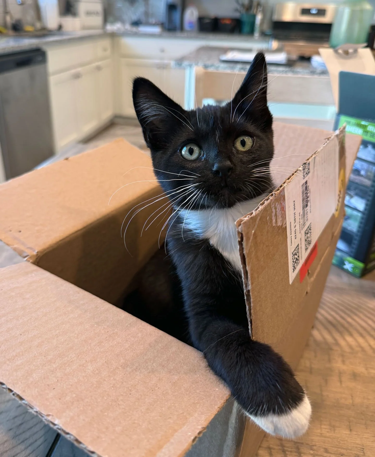 “Our black lab and German shepherd are both females, and while they both get along wonderfully with Onyx, she’s built a special bond with our black lab Sage. They play and cuddle and Sage even grooms Onyx as if she were her own puppy! Onyx loves all of our son’s toys -- she thinks they’re hers – and so they share them. She also loves playing in empty boxes.
