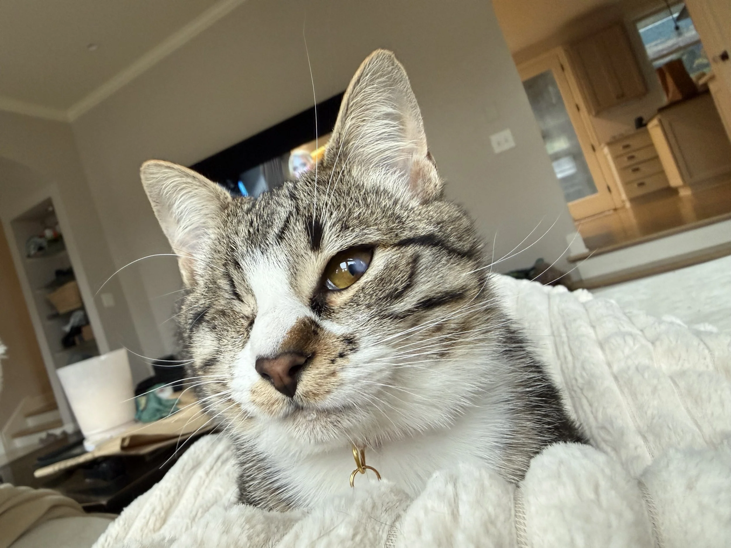 “I picked her up at her foster home and her adjustment to living here was immediate. She instantly felt asleep in my lap and has ruled our place ever since! Now I couldn’t imagine my life without her. Patch is the most goofy, adorable and brave kitty. She truly is the best girl, and she makes me laugh all the time. She’s very talkative, adores her toys and especially enjoys roaming all of the high shelves in the house.