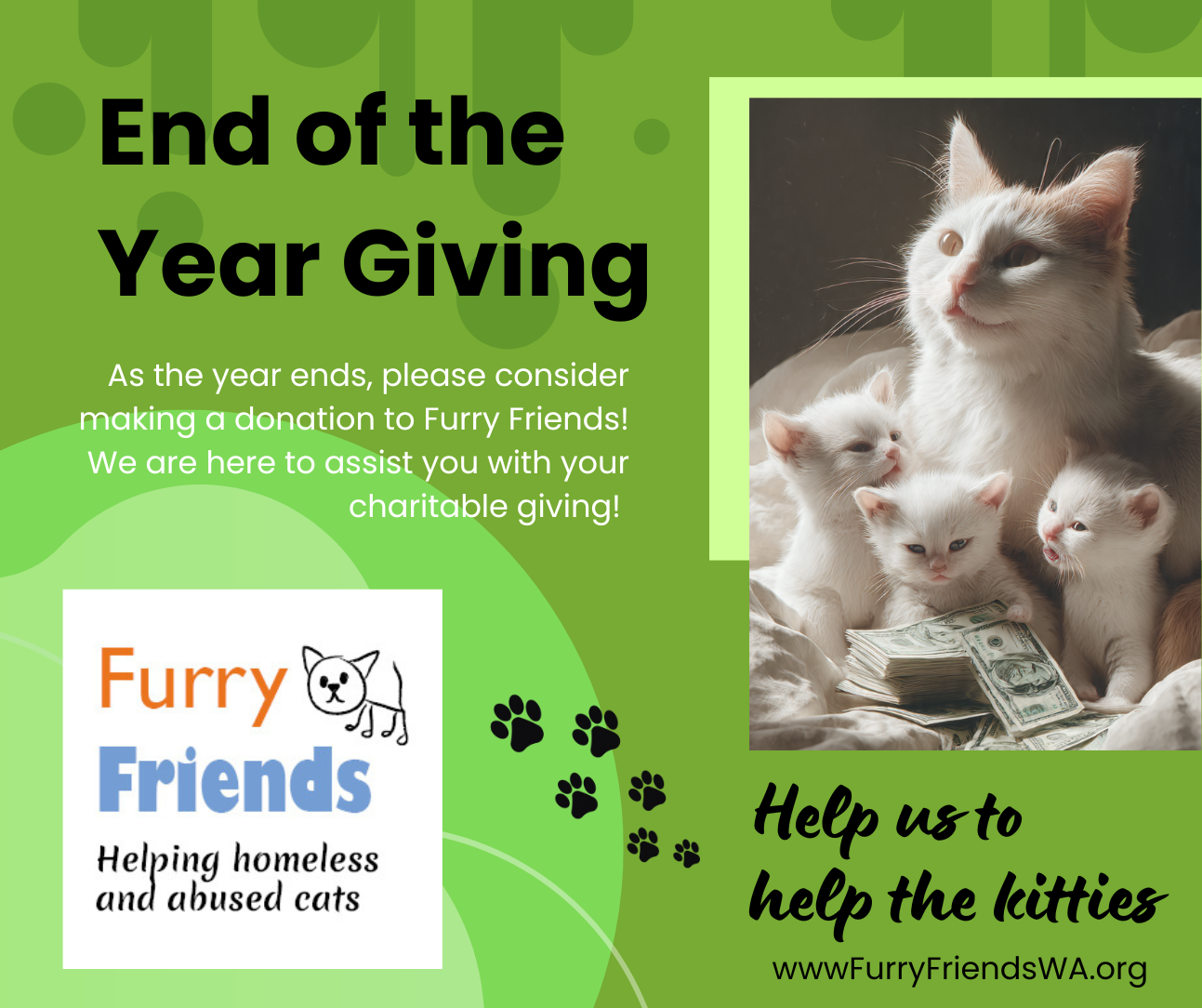 Credit card gifts via the furry friends online giving page may be made through 11:59 p.m. PST, Wednesday, December 31, 2025, at furryfriendswa.org/donate/.