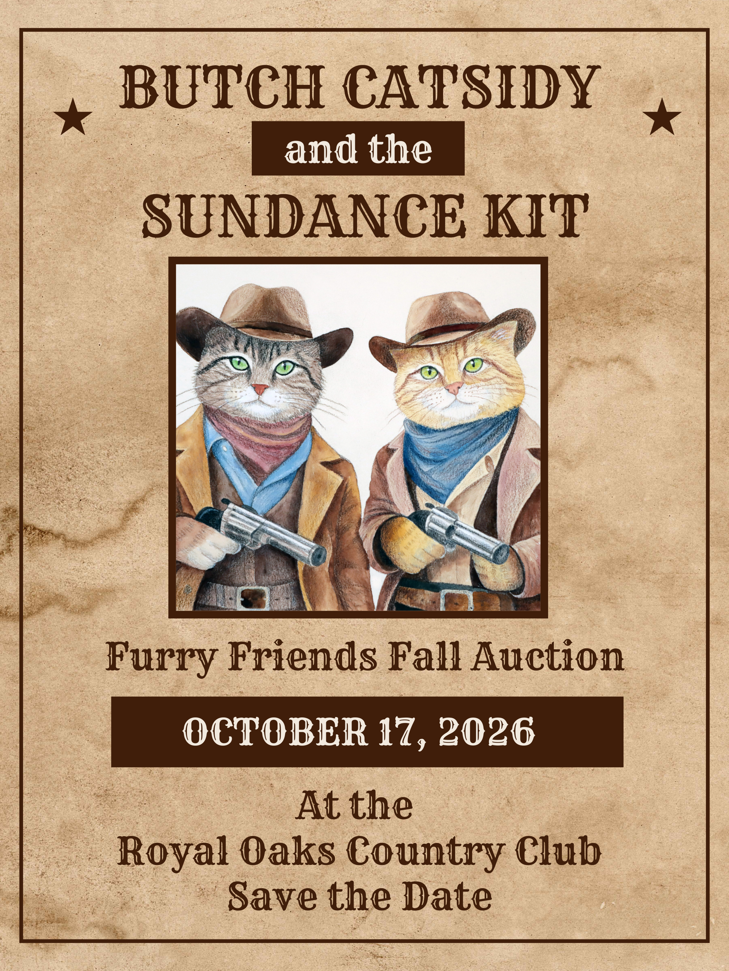 (Vancouver, WA) Furry Friends is hosting its annual fall in-person dinner and auction fundraiser on Saturday, October 17 from 4:30 PM to 9 PM at The Royal Oaks Country Club, 8917 NE Fourth Plain Blvd, Vancouver, WA 98662. The theme for this year’s auction will be Butch Catsidy and the Sundance Kit. There will be an in-person Live and Silent Auction, contests and games, raffles, best dressed contest, dessert dash and more. There will also be an online auction that will be held at the same time. This year, Furry Friends is celebrating their 27th year of operation.